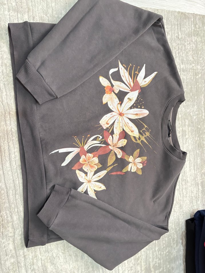 Kadınlar için bol kesim, uzun kollu ve yuvarlak yakalı gri sweatshirt. Önünde çiçek baskısı bulunan yumuşak sentetik kumaştan yapılmıştır, günlük ve sokak tarzı için uygundur. Bir iki kere giyildi çok iyi durumda bir defosu bulunmamakta rahatlıkla tercih edebilirsiniz M- Beden uyumludur oversize isteyen S beden kullanıcıları da tercih edebilir