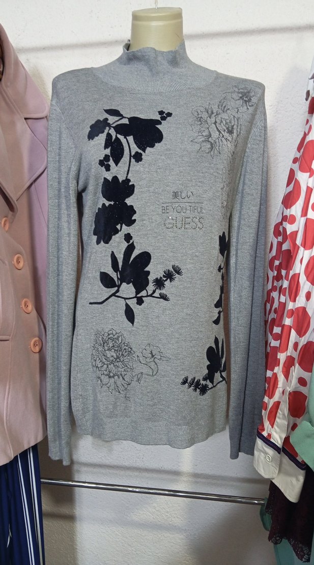 Gri renkli, uzun kollu ve yuvarlak yakalı triko kazak. Çiçek baskılı ve 'BE YOU TIFUL GUESS' yazılı, rahat kesim. Günlük kullanıma uygun, şık ve rahat bir parça.