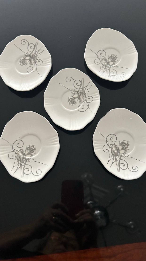 Gri çiçek desenli, beyaz renkli, dalgalı kenarlı 5 adet tatlı tabağı seti. Her tabakta zarif gül ve kıvrımlı süslemeler bulunur. ️