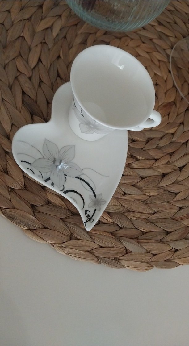 Gri çiçek desenli beyaz porselen fincan ve kalp şeklinde tabak, zarif ve şık bir görünüme sahiptir ☕. 6 KİŞİLİKTİR