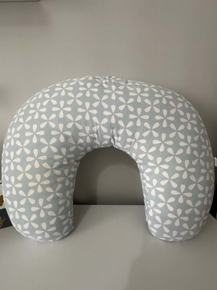 Gri renkte, çiçek desenli, hamilelik ve emzirme için destek sağlayan yumuşak bir yastık.