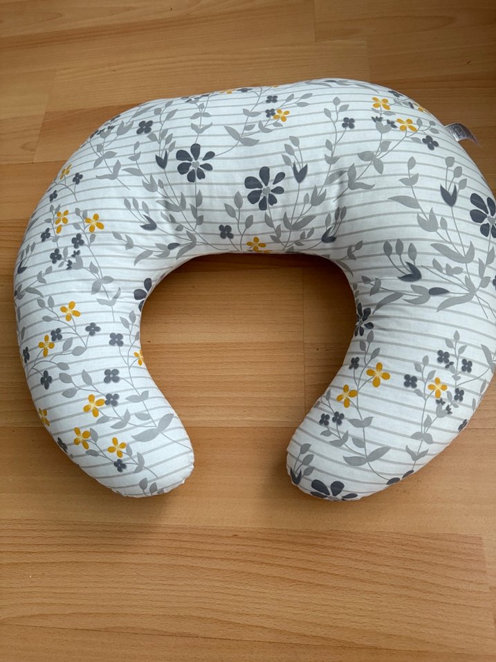 Gri zemin üzerine sarı ve koyu gri çiçek desenleri bulunan hamilelik ve emzirme yastığıdır. Rahatlık ve destek sağlar.