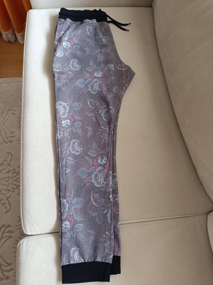 Uzun, gri renkli çiçek desenli eşofman altı hiçbir sorun yoktur