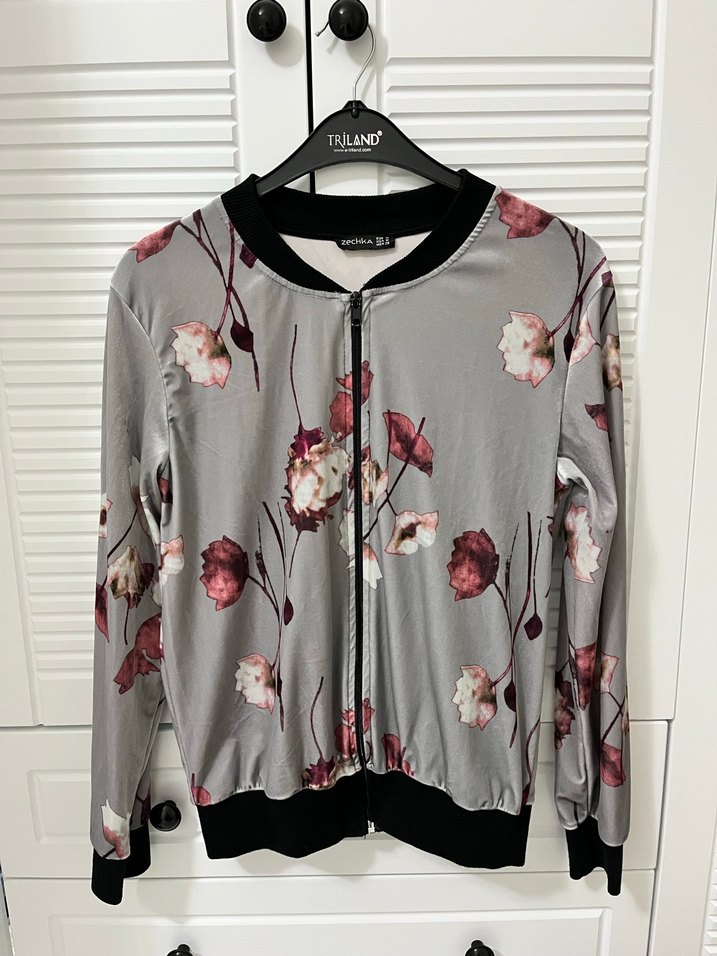 Kadın ceket, bol kesim, uzun kollu ve yuvarlak yaka. Sentetik kumaştan, gri zemin üzerinde çiçek desenli ve fermuarlı, günlük rahat stil için uygun.