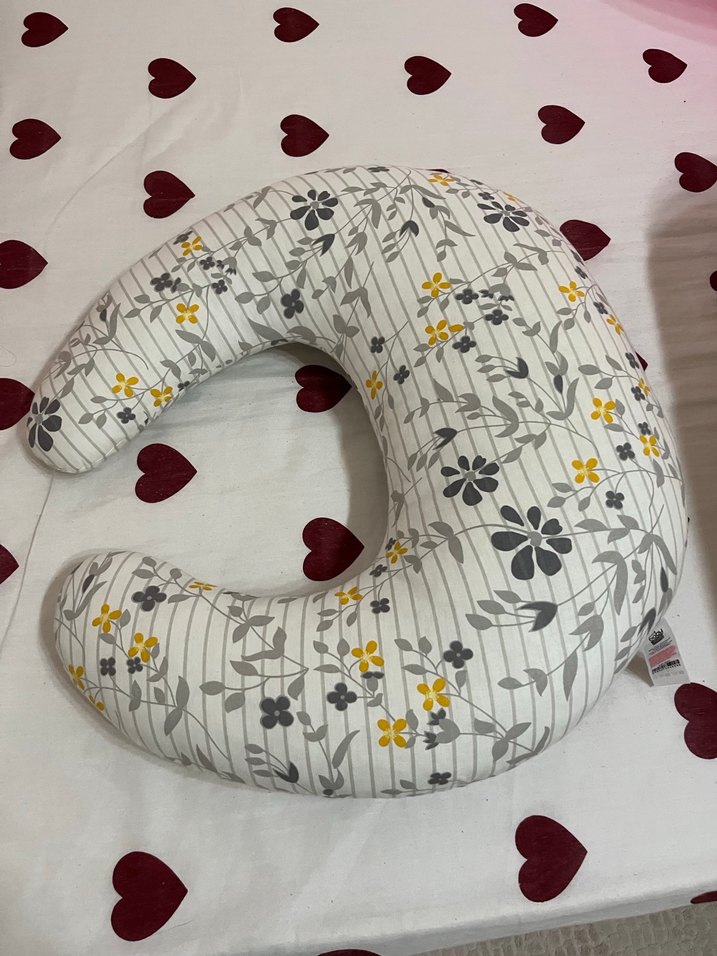 Gri zemin üzerinde sarı ve koyu gri çiçek desenleri bulunan hamile ve emzirme yastığı, konforlu destek sağlar.