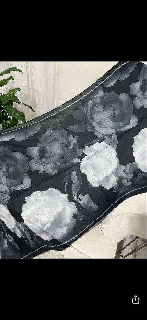 Gri renkte, ipek dokulu ve çiçek desenli, drapeli kadın şalı. Modern Paris tarzına uygun.