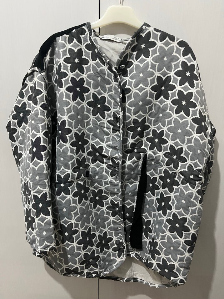 Gri çiçek desenli, düğmeli, kısa kesim kadın ceket. Uzun kollu, bol kesim ve sentetik kumaştan üretilmiştir. Sokak stili ve bohem tarzı yansıtır.