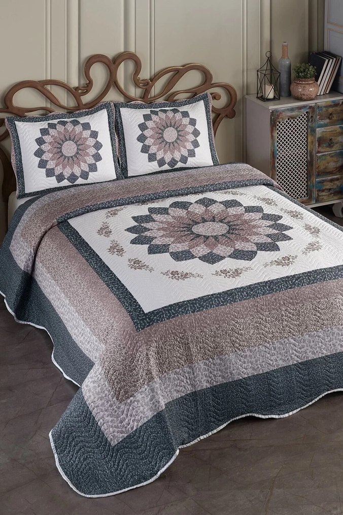 Gri Çiçek Desenli Kapitone Yatak Örtüsü