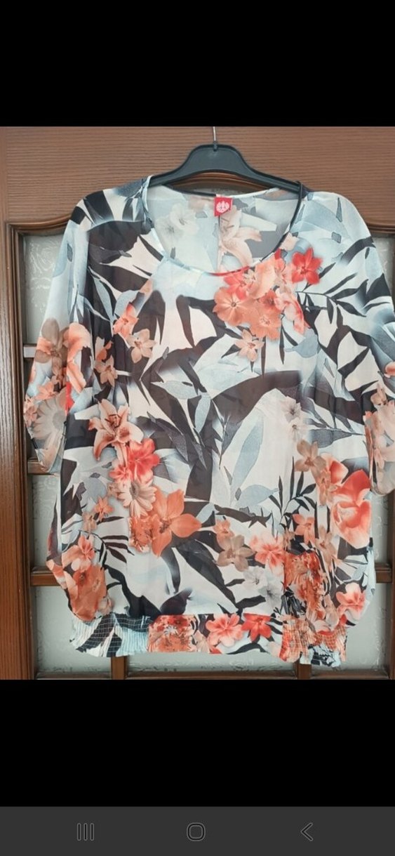 Gri renkte, çiçek desenli, kısa kollu ve salaş kesim bluz. Tekne yaka ve drapeli tasarımıyla günlük kullanıma uygun, yumuşak sentetik kumaştan yapılmıştır.
