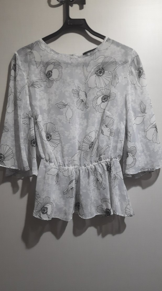 Gri renkte, çiçek desenli, kısa kollu ve fırfırlı detaylı bol kesim bluz, yumuşak sentetik kumaştan üretilmiştir.