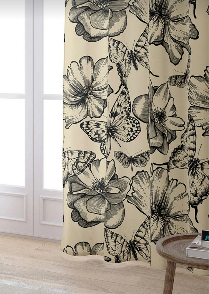 Gri ve beyaz tonlarda modern çiçek desenli perde, odanıza zarif ve doğal bir hava katıyor. Çiçek ve kelebek detaylarıyla şık bir tasarım sunar.
