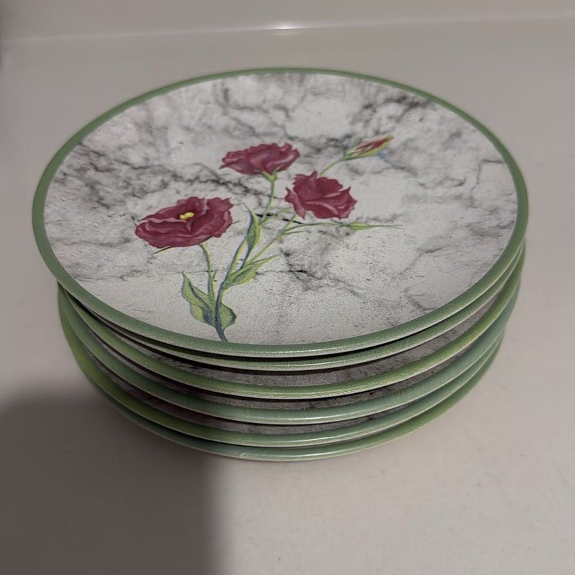 Gri zemin üzerine kırmızı çiçek desenli, dokulu yüzeye sahip yemek tabakları seti. Sofralarınıza şıklık katacak. Hiç kullanılmadı etiket üzerindedir.