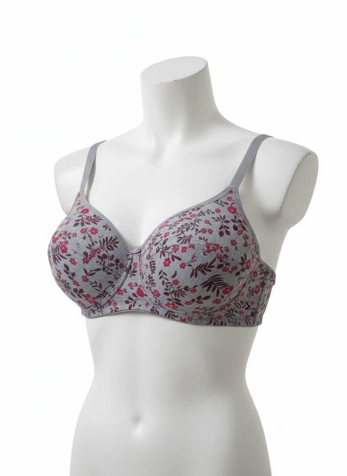 Gri renkte, çiçek desenli, çağdaş athleisure tarzında, normal boyda destek sağlayan sütyen.