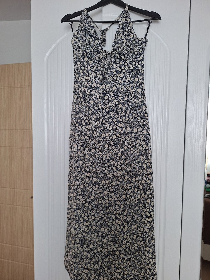Gri Çiçek Desenli Uzun Bohem Elbise