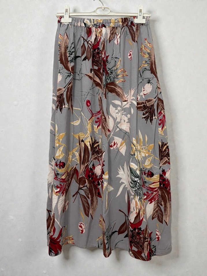 Gri çiçek desenli uzun etek, rahat dökümlü kesimi ve yumuşak sentetik kumaşıyla bohem tarzı yansıtıyor. Özel dikim.