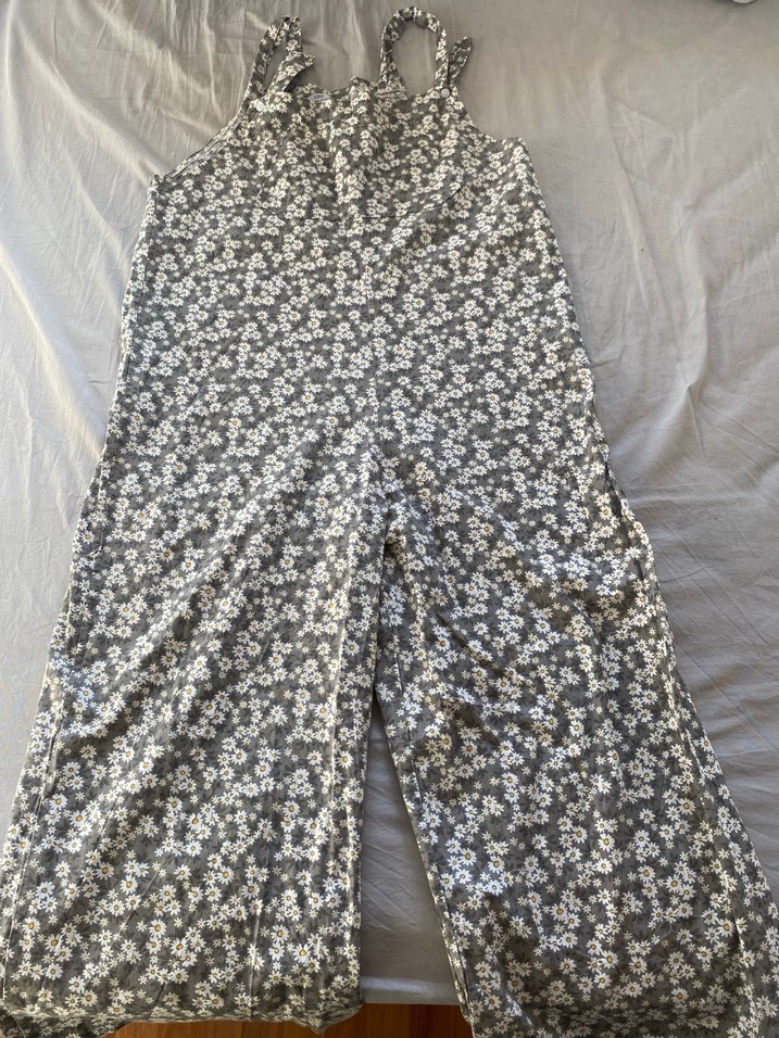 Gri çiçek desenli, düğmeli, V yaka, kolsuz ve bol kesim kadın tulumu. Yumuşak sentetik kumaştan üretilmiştir, günlük kullanım için uygundur.