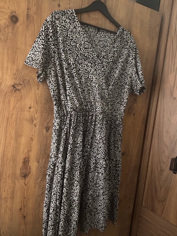 Gri renkte, çiçek desenli midi elbise. V yaka, kısa kollu ve bol kesimdir. Drapeli tasarımıyla günlük sokak stiline uygundur.