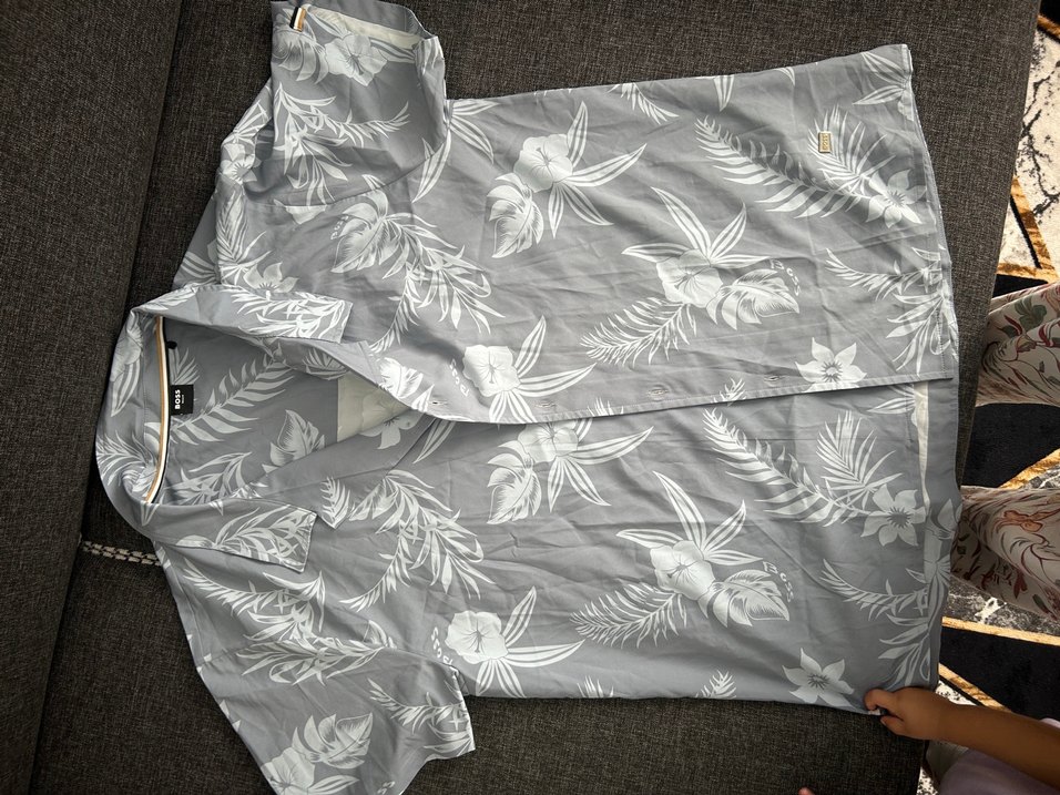 Gri zemin üzerine beyaz çiçek desenleriyle, kısa kollu ve V yakalı, rahat kesimli erkek gömleği. Hafif sentetik kumaştan, günlük sokak stiline uygun.