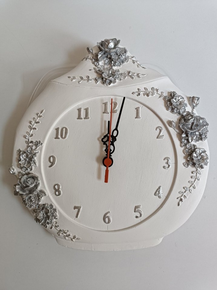 Gri çiçek detaylı, klasik sayılı beyaz duvar saati. Belirgin rakamlar ve dekoratif süslemeler içerir. ️