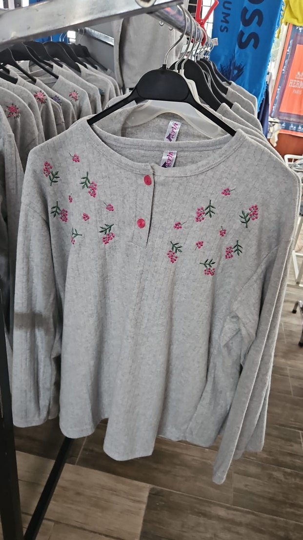 bedenler mevcuttur.Gri renkli, uzun kollu, çiçek işlemeli ve düğmeli pijama, rahat.