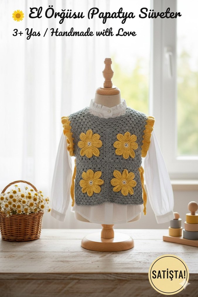 3 yaş ve üzeri kız çocukları için el örgüsü, gri renk, sarı çiçek nakışlı, kolsuz ve bol kesim süveter.