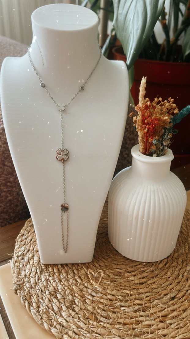 Uzun uzunlukta, gri renkte, çiçek desenli ve boncuklu detaylara sahip bohem tarzda kadın Şahmeran Çelik olup kararma ve alerjen yapmaz.