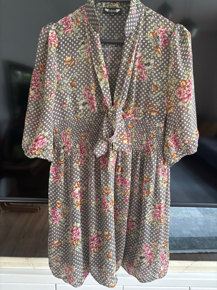 Gri çiçek desenli, düğmeli, V yakalı bol kesim . Kısa kollu, rahat dokulu, romantik akşamlar için uygun.Almanya’dan butikten alındı,çok az giyildi.