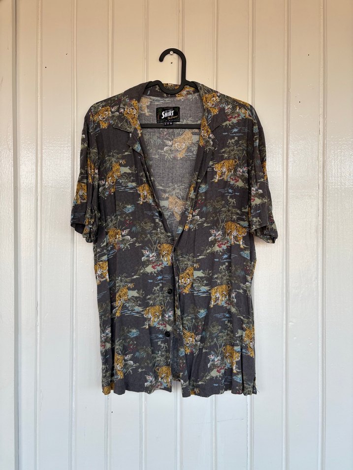 Gri çiçek desenli, düğmeli, kısa kollu, bol kesim, yakalı gömlek. Rahat sentetik kumaştan yapılmıştır.