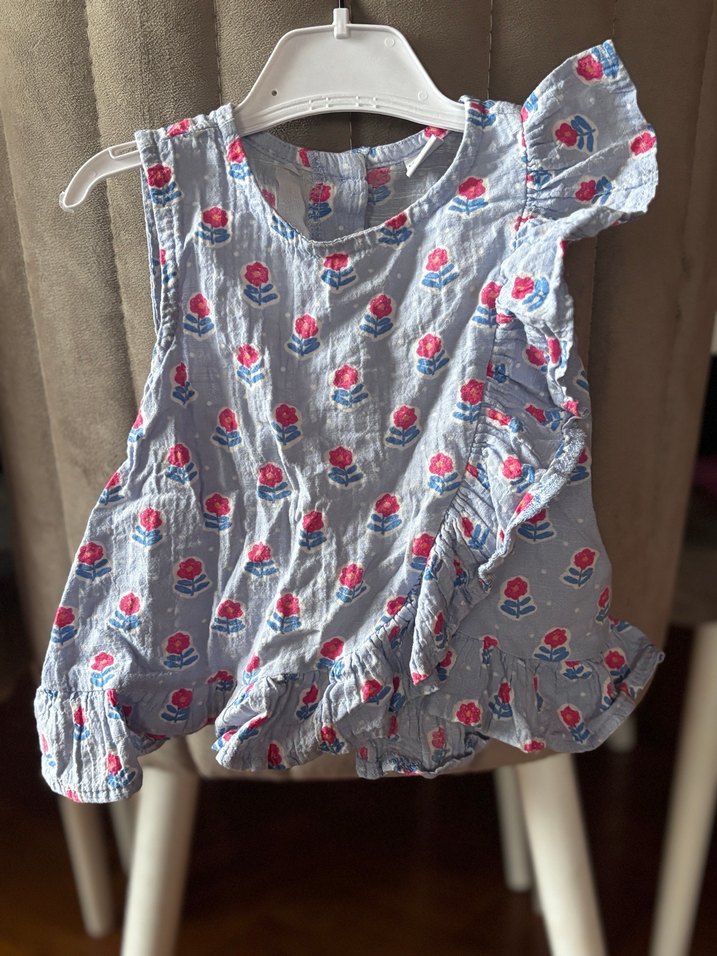 Kolsuz, bol kesim ve bisiklet yaka olan kız çocuk elbisesi, volan detaylıdır. Yumuşak tekstil kumaş üzerine çiçek baskılıdır, bohem tarzı yansıtır.