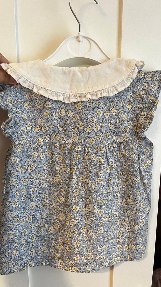 Mavi çiçekli baskılı, kısa kollu, bol kesim kız bluz , fırfırlı yakasıyla vintage tarzını yansıtıyor.