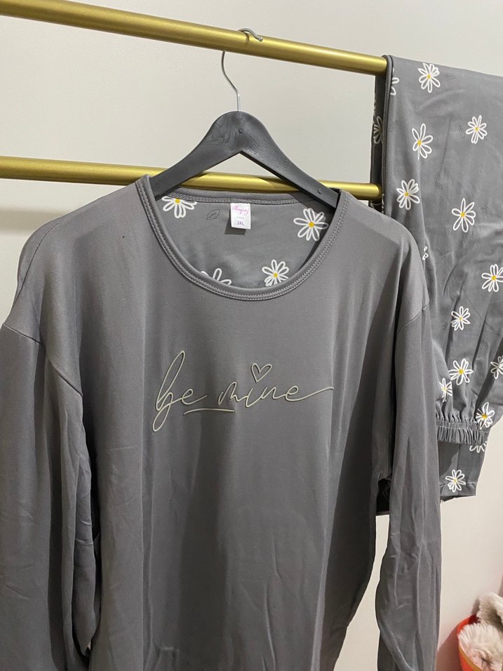 Gri renkte, uzun kollu ve bol kesim kadın pijama takımı. Üstte "be mine" yazısı ve papatya desenleri bulunur, rahat sokak stili için uygun.