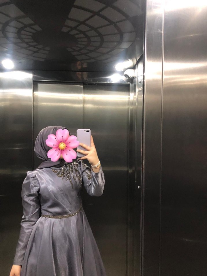 Yüksek yakalı, uzun kollu ve drapeli bu gri abiye elbise, çiçek desenleriyle süslenmiş. Düğünler için uygun, vücuda oturan kesim.