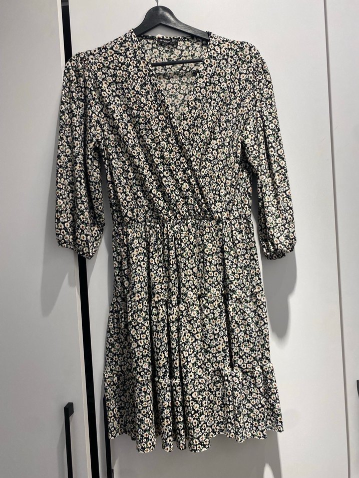 Gri çiçek desenli, V yakalı ve düğmeli, rahat kesim midi elbise. Yumuşak sentetik kumaştan, günlük kullanım için bohem tarzda.