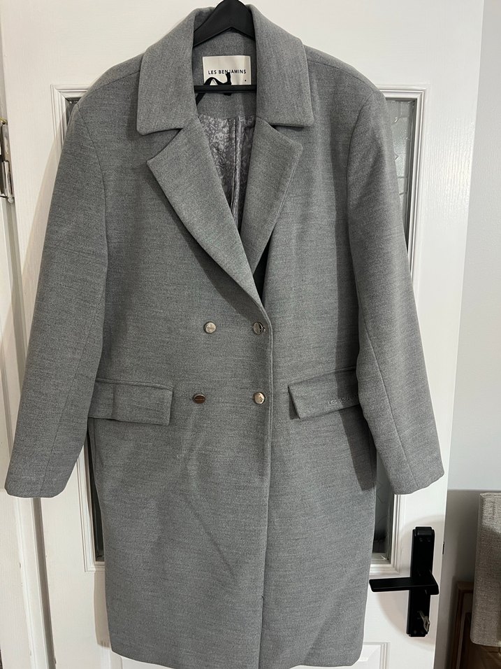 Gri renkte, çift düğmeli, klasik yaka ve kapaklı ceplere sahip yumuşak dokulu kaban. Serin havalar için uygun.