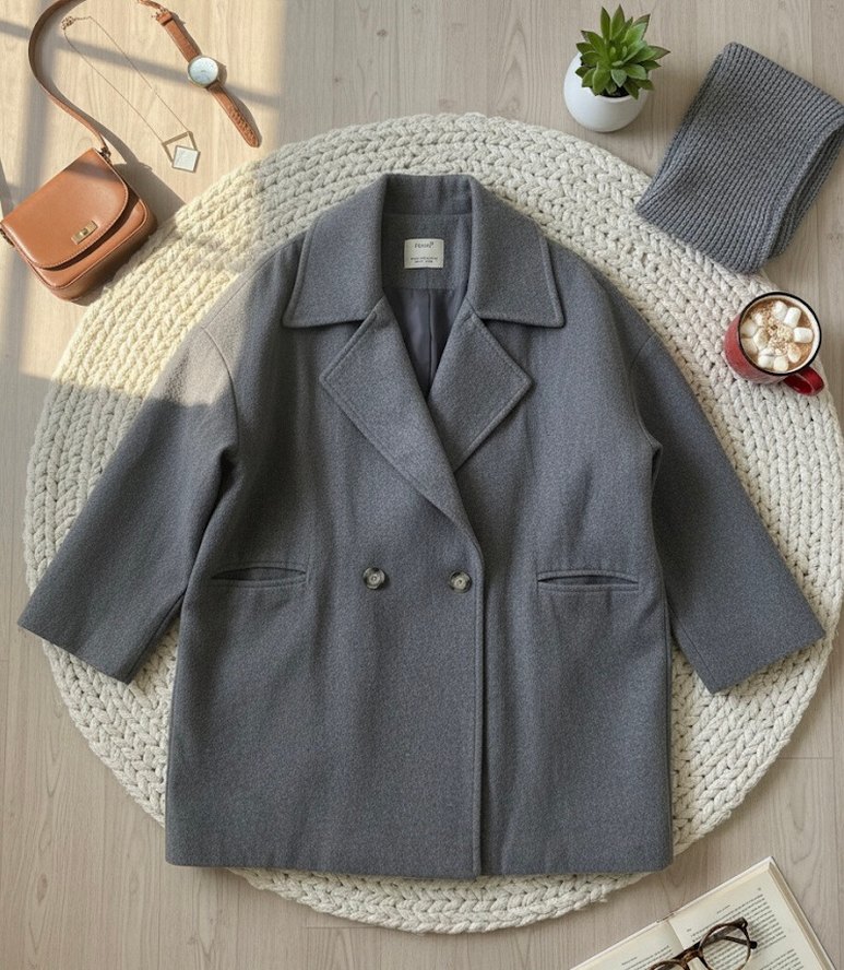 Geniş yakalı, çift düğmeli ve yan cepli gri kaban. Soğuk havalar için yumuşak ve sıcak dokulu.