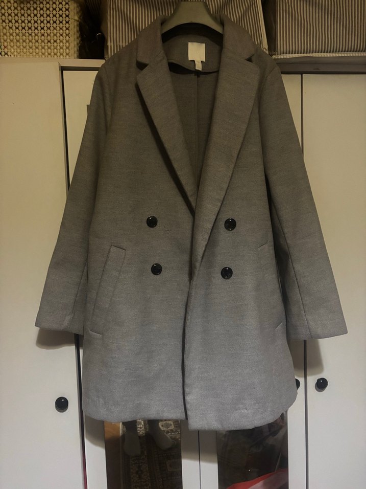 Klasik yaka, çift düğmeli ve yan cepli gri kaban, sade ve şık bir görünüm sunar.