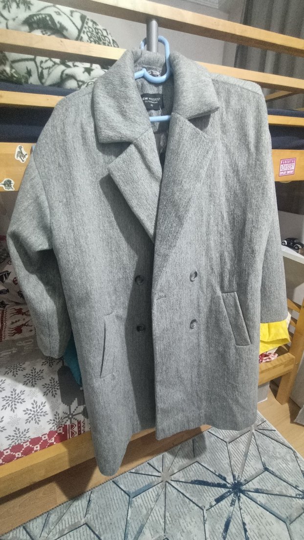 Yumuşak ve sıcak kumaştan yapılmış gri çift düğmeli kaban, klasik yaka ve yan ceplere sahiptir. diz altı uzunluğunda