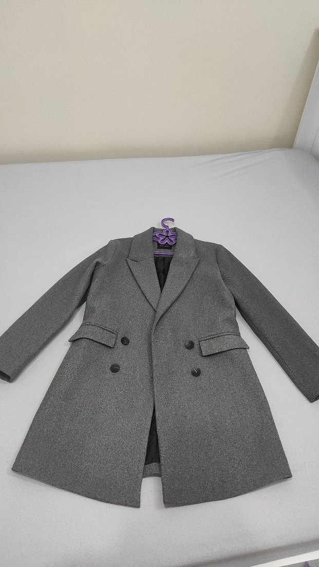 Gri renkli, çift düğmeli, kuşak cepli ve dar kesim kaban.