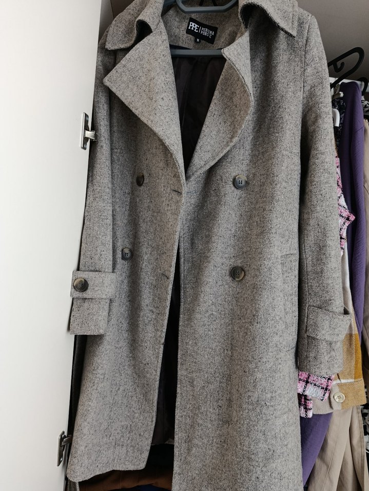 sıfırdan farksız Gri renkte, çift düğmeli, geniş yakalı ve düğmeli manşetli kadın kabanı. Yumuşak dokulu kumaş ve astar bulunur.