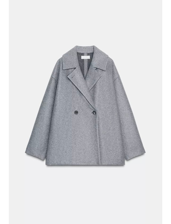 Geniş yakalı ve çift düğmeli, gri renk kısa kaban, serin havalar için rahat ve şık bir seçenektir.