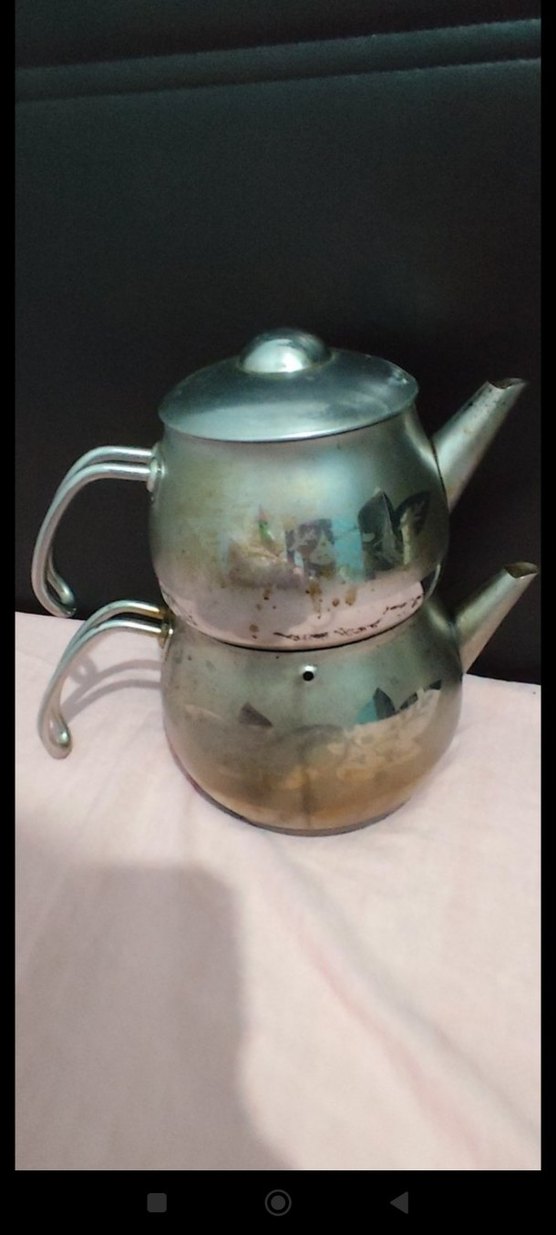 çaydanlık temizlik ve parlaklik islemi yapılsa harika zamanım yok yoksa yapardim İki kulplu ve iki ağızlı, çay demlemek için kullanılan çift katlı metal çaydanlık. hatta bu çaydanlık1500 e giderdi