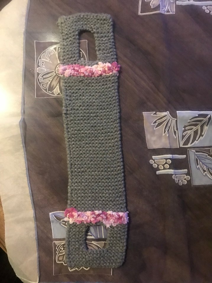 İki ucunda dikdörtgen açıklıkları ve pembe süslemeleri olan, desensiz gri yoga kayışı. ♀️