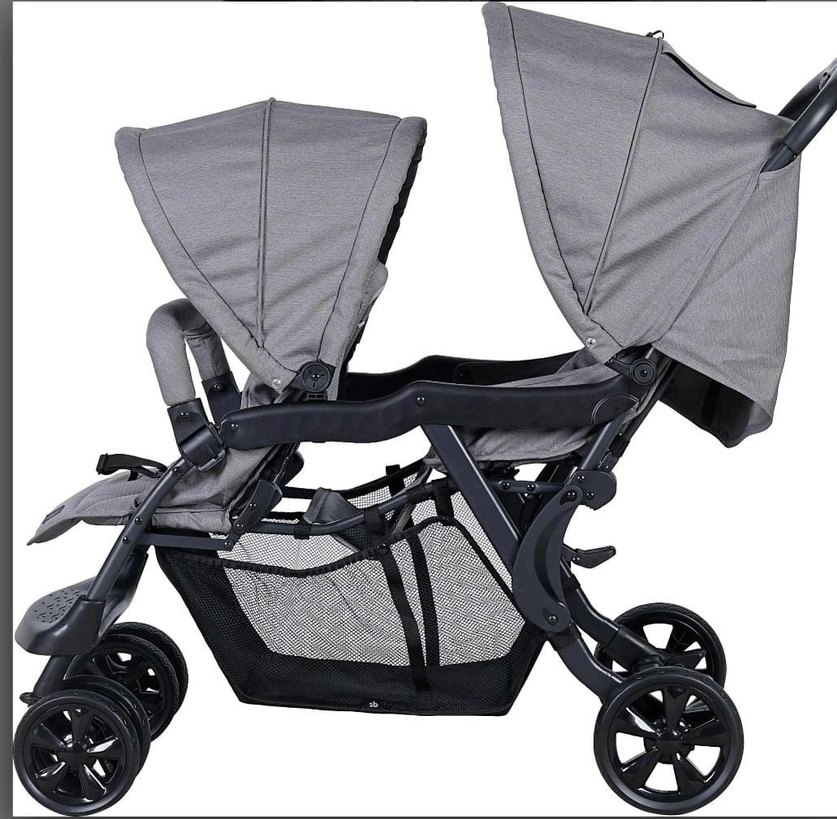 Ayarlanabilir tente ve fileli saklama sepetine sahip gri çiftli bebek arabası, iki çocuk için uygundur. Tek yönlüdür. 0-18 kilo araligindadir . 2 yıl garantilidir