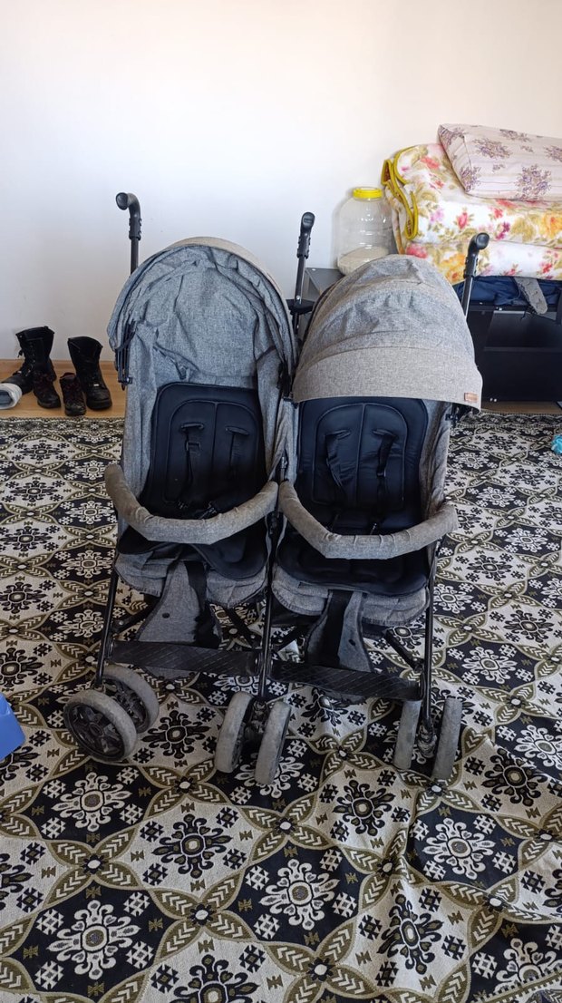 Ayarlanabilir başlıklar ve emniyet kemerleri ile gri çiftli bebek arabası, iki çocuğun yan yana rahat oturması için tasarlanmıştır.