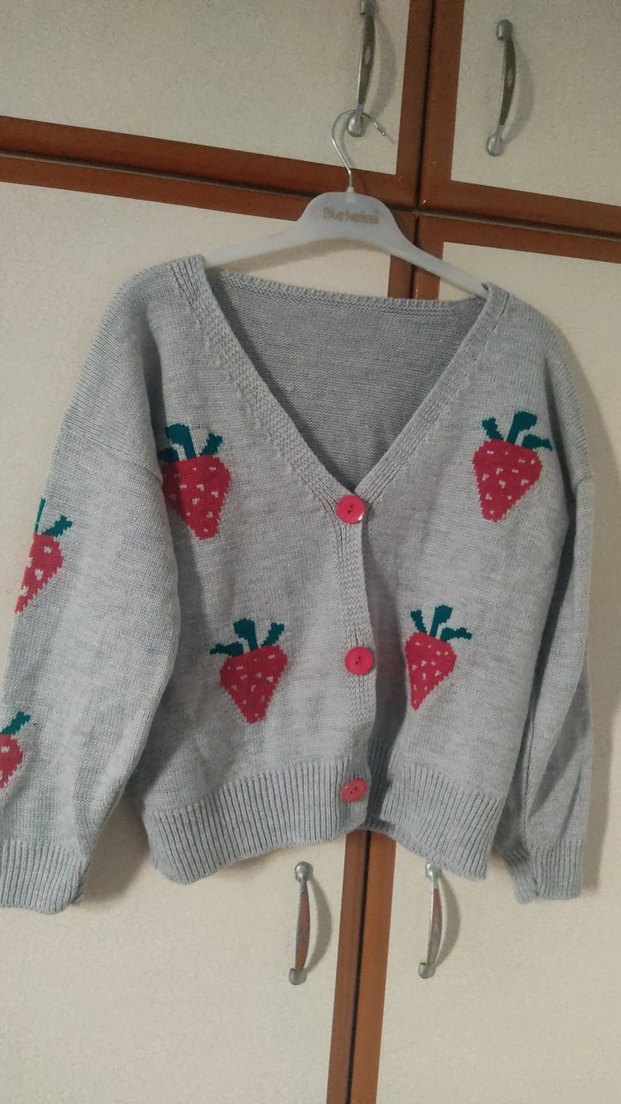 Gri renkli, çilek işlemeli, uzun kollu, bol kesim örgü hırka, rahat sokak stili için uygundur.