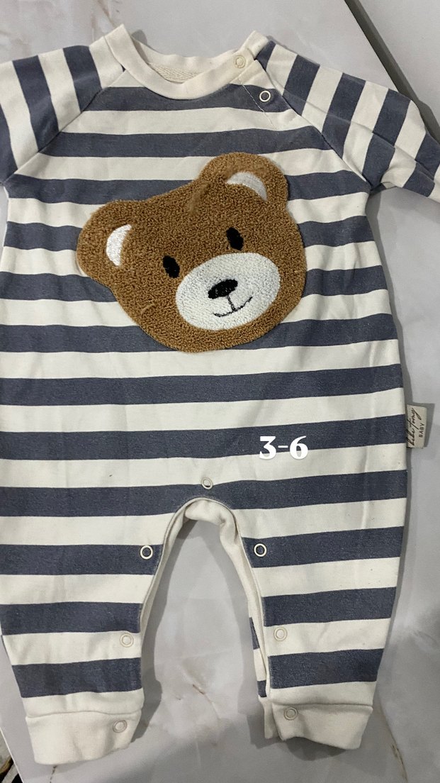 Gri çizgili ve ayıcık nakışlı bebek tulumu, düğmeli ve yuvarlak yakalıdır. Yumuşak ve sıcak kumaştan üretilmiştir, günlük kullanıma uygundur.
