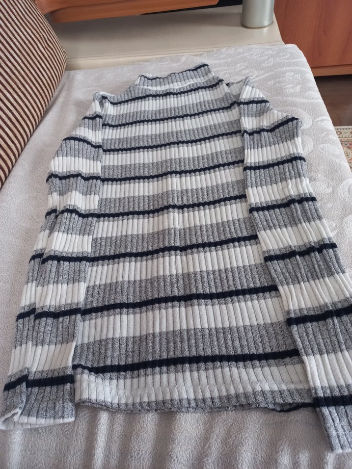 Gri çizgili, balıkçı yakalı, uzun kollu, fit kesim örme kadın kazak. Normal boyda, günlük rahat kullanıma uygun.