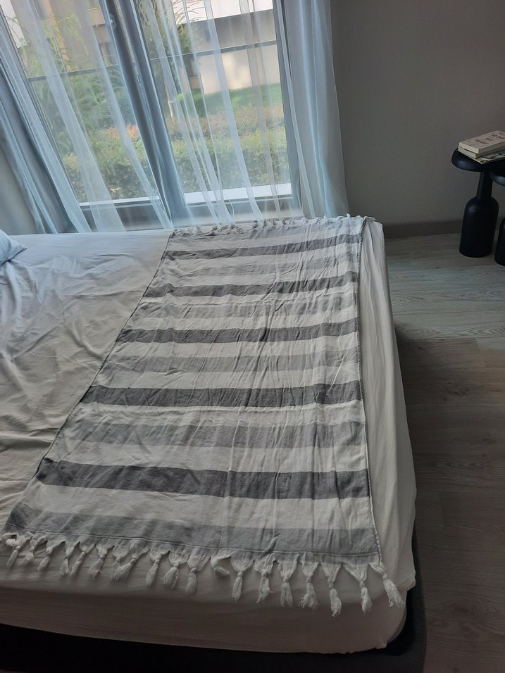Gri tonlarında çizgili desene sahip, yumuşak dokulu ve püskül detaylı yatak örtüsüdür. Yatak odasına sade bir şıklık katar. ️