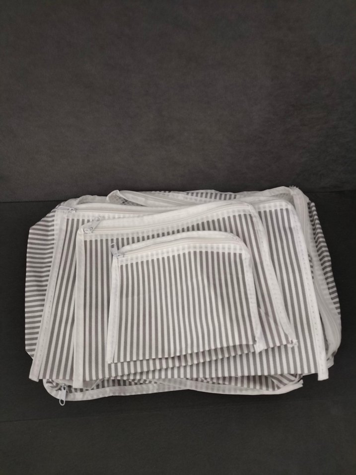Çoklu fermuarlı bölmeleriyle gri çizgili bavul düzenleyici seti, seyahatte düzenli paketleme ve kolay erişim sağlar. ✈️