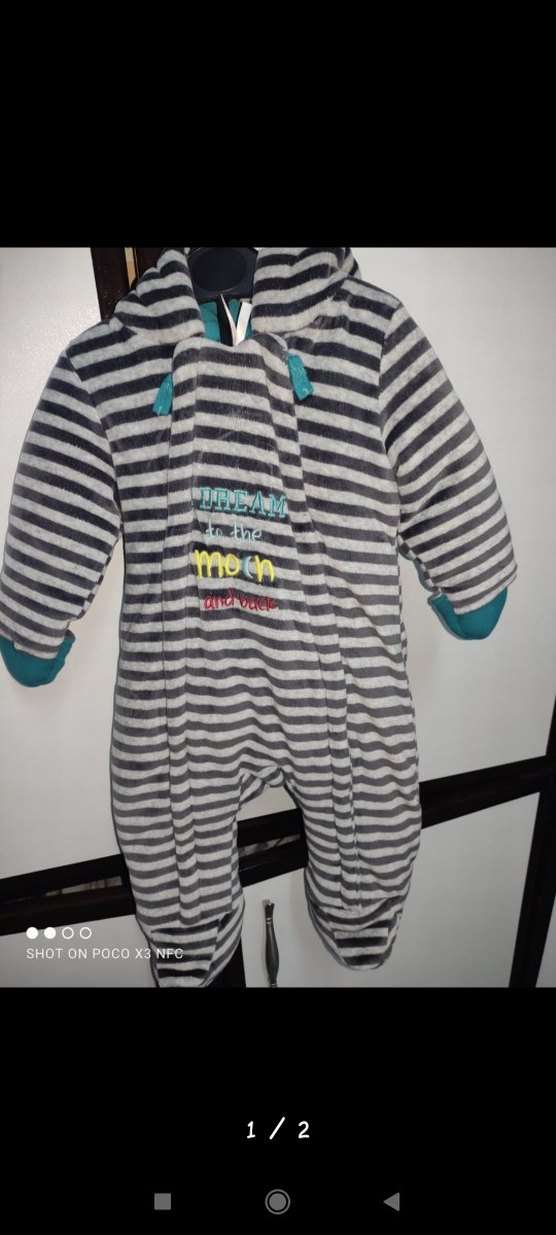Gri çizgili, yumuşak ve sıcak kumaşlı bebek tulumu, Velcro kapamalı ve kapüşonludur. Sokak stili için uygundur.